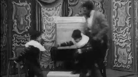 Georges Méliès enters the frame and stands between two tables. He removes his own head and puts it on one of the tables, ...